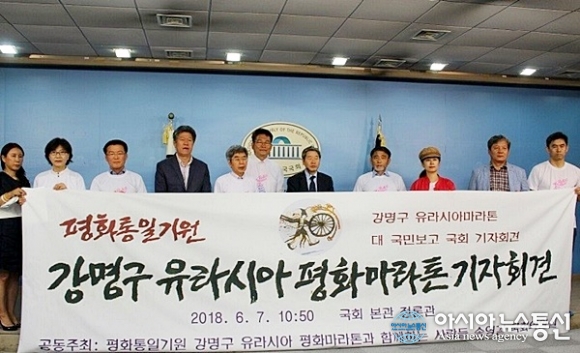 강명구 유라시아 평화마라톤과 함께하는 사람들(이하 평마사)은 7일 국회 정론관에서 송영길 국회의원과 함께 대국민보고 기자회견을 가진데 이어 김성곤 사무총장을 방문해 향후 계획에 대한 협조를 요청했다.