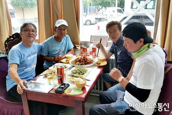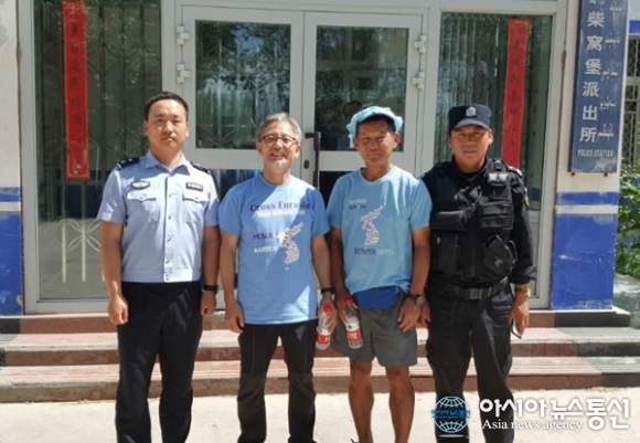 | 중국 우루무치 부근에서 이대수 목사와 함께 파출소 공안들과 기념사진을 찍고 있다.(사진=이대수) |
