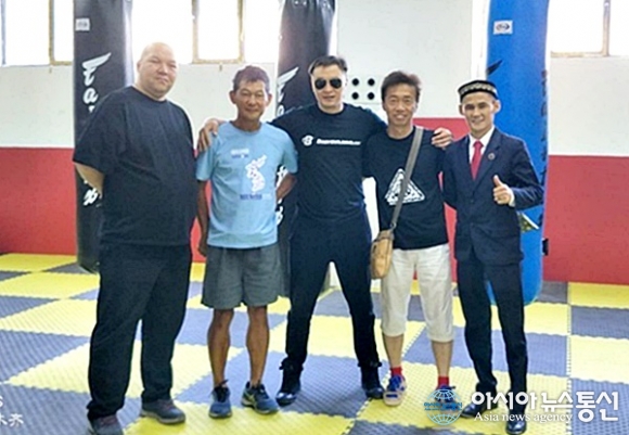 | 중국 우루무치 부근에서 하룻동안 동행해준 현지인들과 함께 한 체육관에서 기념촬영.(사진=정진영) |