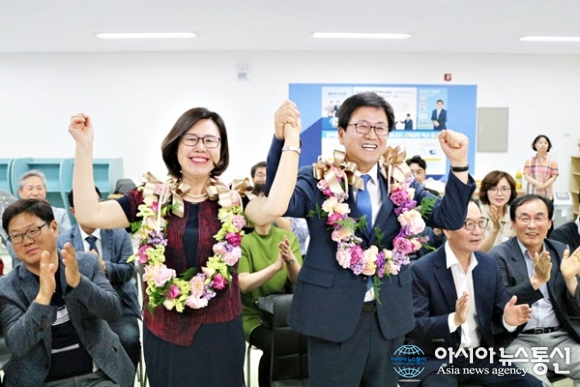 | 최교진 세종시교육감 당선확정자가 축하화환을 받고 기뻐하고 있다./아시아뉴스통신=홍근진 기자 |