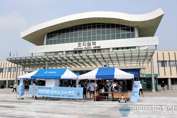 | 한국YMCA전국연맹이 주최하는 시장 및 교육감 모의투표가 13일 세종시YMCA 주관으로 조치원역 광장에서 진행되고 있다./아시아뉴스통신=홍근진 기자 |