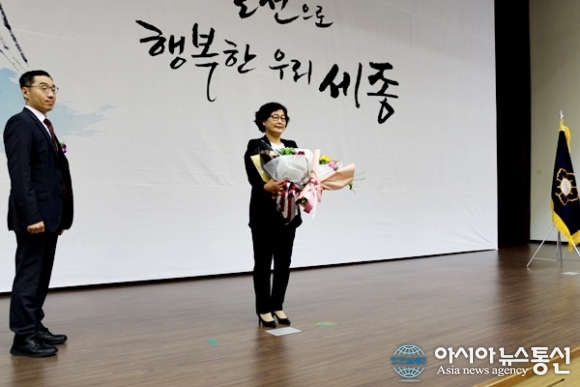 | 15일 세종시 선거관리위원회가 세종컨벤션센터에서 개최한 제7회 전국동시지방선거 당선증 교부식에서 중앙당 행사로 참석하지 못한 이춘희 시장 당선인을 대신해 부인 서명숙 씨가 당선증을 받았다./아시아뉴스통신=홍근진 기자 |