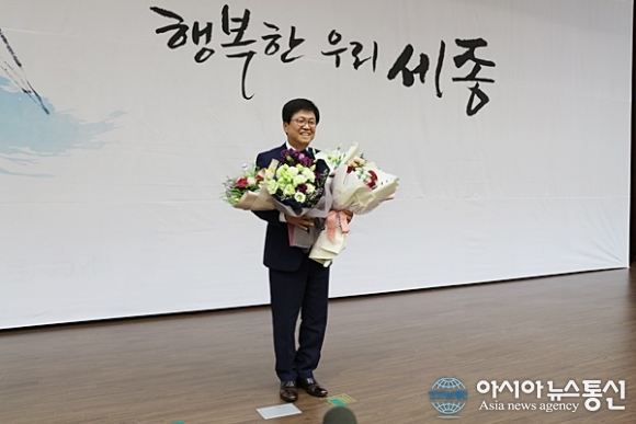| 15일 세종시 선거관리위원회가 정부세종컨벤션센터에서 개최한 제7회 전국동시지방선거 당선증 교부식에서 최교진 교육감 당선자가 당선증을 받고 기뻐하고 있다./아시아뉴스통신=홍근진 기자 |