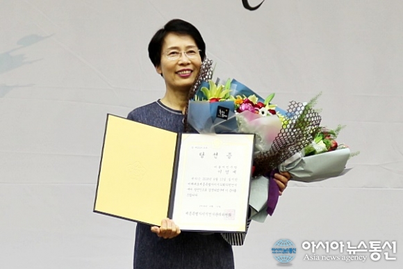 | 15일 세종시 선거관리위원회가 정부세종컨벤션센터에서 개최한 제7회 전국동시지방선거 당선증 교부식에서 이영세 더불어민주당 비례대표 당선인이 당선증을 받고 기뻐하고 있다./아시아뉴스통신=홍근진 기자 |