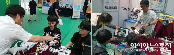| 대구과학대학교가 15일 대구학생문화센터에서 열린 '2018 교육기부 진로체험 인증기관 박람회'에 선보인 '측량장비 전시 및 측량드론 체험관'을 학생들이 관람하고 있다.(사진제공=대구과학대학교) |
