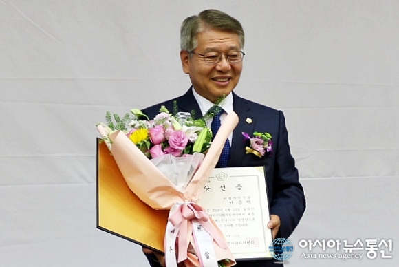 | 15일 세종시 선거관리위원회가 정부세종컨벤션센터에서 개최한 제7회 전국동시지방선거 당선증 교부식에서 서금택 시의원 1선거구 당선인이 당선증을 받고 기뻐하고 있다./아시아뉴스통신=홍근진 기자 |