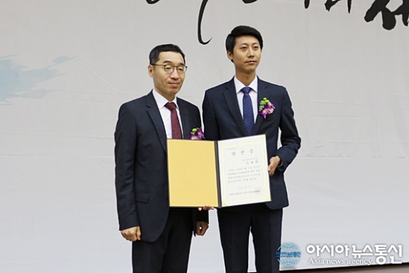 | 15일 세종시 선거관리위원회가 정부세종컨벤션센터에서 개최한 제7회 전국동시지방선거 당선증 교부식에서 이태환 시의원 2선거구 당선인(오른쪽)이 호제훈 위원장과 기념사진을 찍고 있다./아시아뉴스통신=홍근진 기자 |