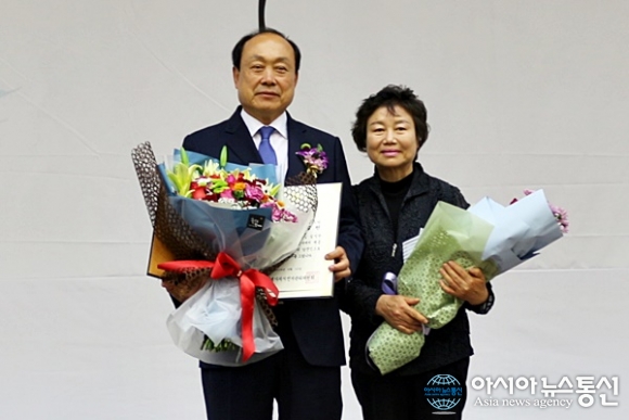 | 15일 세종시 선거관리위원회가 정부세종컨벤션센터에서 개최한 제7회 전국동시지방선거 당선증 교부식에서 이재현 시의원 6선거구 당선인이 부인과 기념사진을 찍고 있다./아시아뉴스통신=홍근진 기자 |