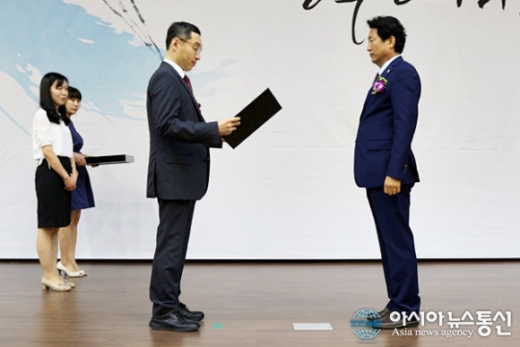 | 15일 세종시 선거관리위원회가 정부세종컨벤션센터에서 개최한 제7회 전국동시지방선거 당선증 교부식에서 윤형권 시의원 9선거구 당선인(오른쪽)이 호제훈 위원장으로부터 당선증을 받고 있다./아시아뉴스통신=홍근진 기자 |