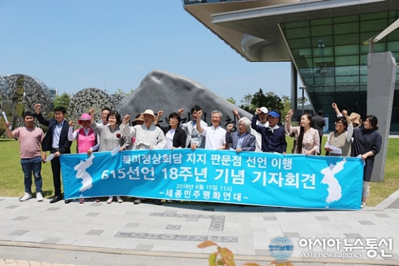 | 세종시민주평화연대가 15일 6.15선언 18주년을 맞아 시청 앞 광장에서 한반도의 평화를 기원하고, 최근 조성되고 있는 화해 무드를 응원하는 기자회견을 하고 있다./아시아뉴스통신=홍근진 기자 |
