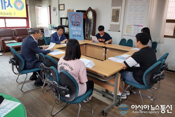 | 세종YMCA가 23일 회관에서 청소년 모의투표 당선자 최교진 교육감에게 당선증을 전달하고 참가한 학생들과 간담회를 갖고 있다./아시아뉴스통신=홍근진 기자 |