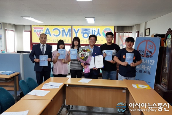 세종시 YMCA가 23일 회관에서 6.13지방선거 청소년 모의투표 당선자 최교진 교육감에게 당선증을 전달했다.