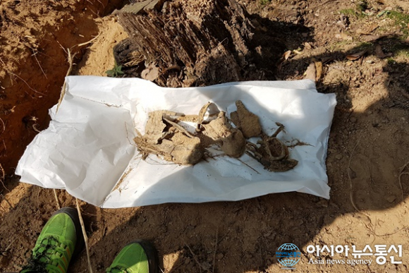 | 한국전쟁 발발 68주년이 다가오고 있는 가운데 23일 세종시 산울리 은고개에서 진행중인 국민보도연맹사건 희생자 유해 발굴현장에서 희생자의 유품으로 보이는 고무신이 발견됐다./아시아뉴스통신=홍근진 |
