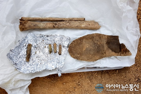 | 세종시 산울리 은고개 시술현장서 발견된 유골과 탄피 신발 바닥 사진./아시아뉴스통신=홍근진 기자 |