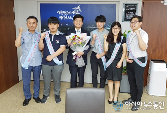 | 세종시 YMCA가 28일 시장실에서 이춘희 시장에게 청소년 모의투표 당선증을 전달하고 간담회를 갖고 있다./아시아뉴스통신=홍근진 기자 |