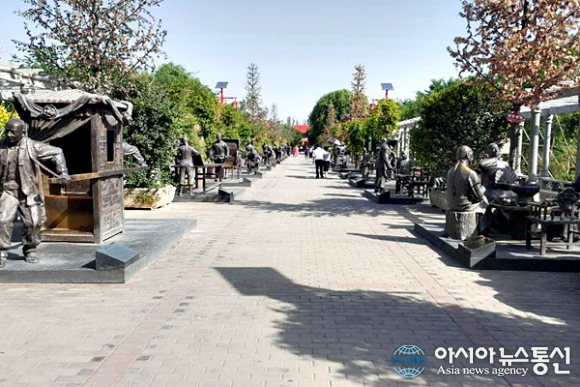 | 중국 간쑤성(甘肅省) 주취안(酒泉) 공원내부. 중국인들의 삶을 표현한 동상들이 눈에 띤다.(사진=장용) |