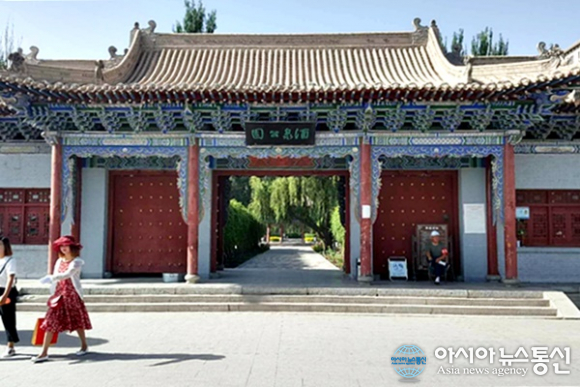 | 중국 간쑤성(甘肅省) 주취안(酒泉) 공원입구. 넓은 차양이 달린 모자 쓴 여인이 눈에 띤다.(사진=장용) |