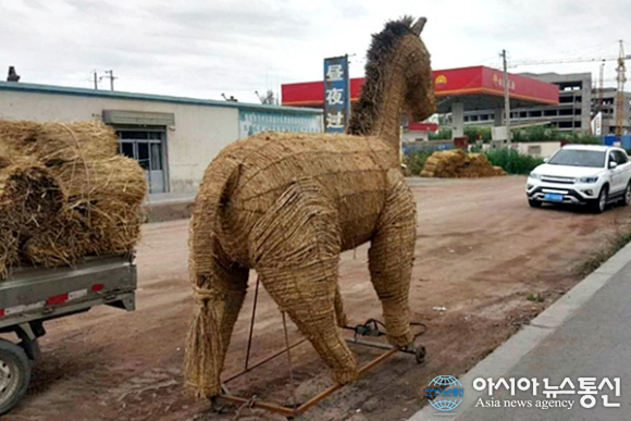 | 중국 간쑤성(甘肅省) 장예를 지나는 길에 축제때 쓰려는지 짚으로 만든 말 모형이 서있다.(사진=장용) |