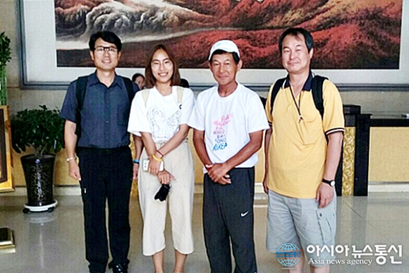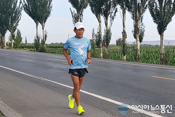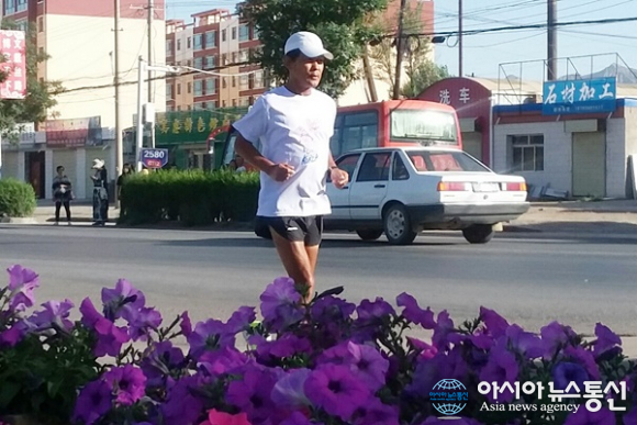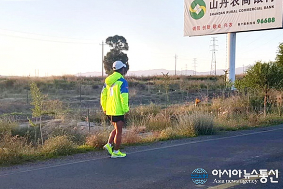 | 중국 간쑤성(甘肅省) 산단현(山丹縣)에서 평화의 나비가 되어 날아가듯 달리고 있는 필자.(사진=장용) |