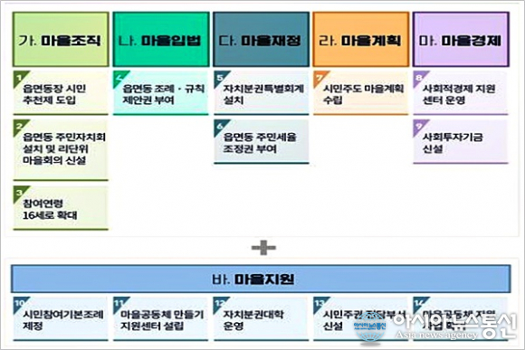 먼저, '마을조직'은 읍.면.동장 시민추천제, 읍.면.동 주민자치회 설치 및 리(里) 단위 마을회의 신설, 마을회의 참여연령 16세 확대 등의 과제를 추진할 계획이다.