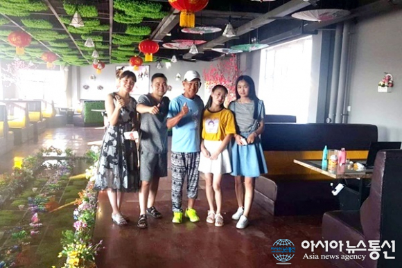 | 중국 간쑤성(甘肅省) 우에이(武威)와 닝샤후이족자치구 중간쯤 식당서 만난 중국인 가족.(사진=장용) |