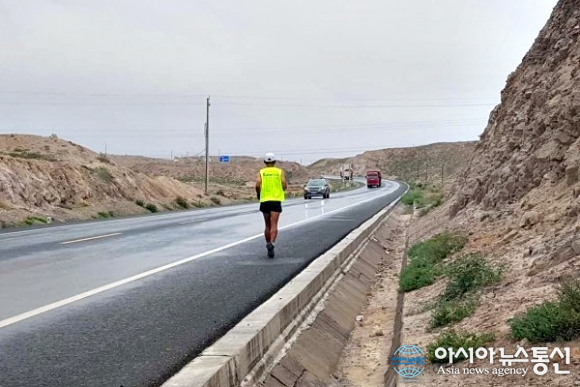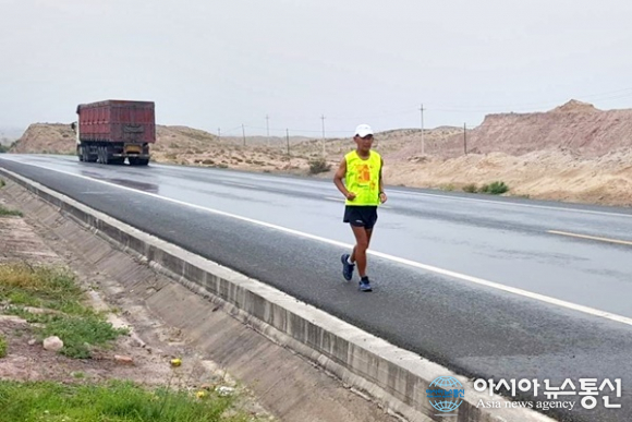 | 중국 간쑤성(甘肅省) 우에이(武威)와 닝샤후이족자치구 중간쯤 비가온 길을 달리는 필자.(사진=장용) |