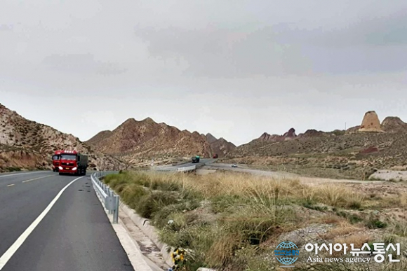 | 중국 간쑤성(甘肅省) 우에이(武威)와 닝샤후이족자치구 중간쯤 황량한 산과 도로가 있다.(사진=장용) |