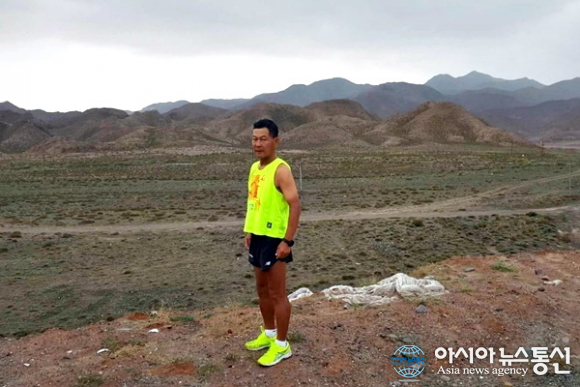| 중국 간쑤성(甘肅省) 우에이(武威)와 닝샤후이족자치구 중간쯤 달리다가 포즈 잡은 필자.(사진=장용) |
