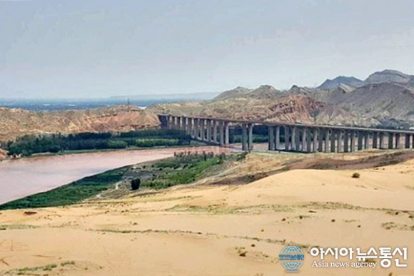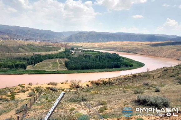 | 중국 닝샤후이족자치구(寧夏回族自治區) 사파토우 절벽 위에서 바라본 황하(黃河)의 모습.(사진=장용) |