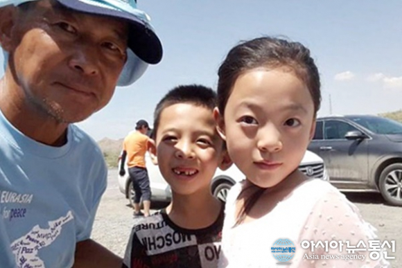 | 닝샤후이족자치구(寧夏回族自治區) 사파토우 언덕을 오르기 전 길에서 만난 어린이들과.(사진=강명구) |