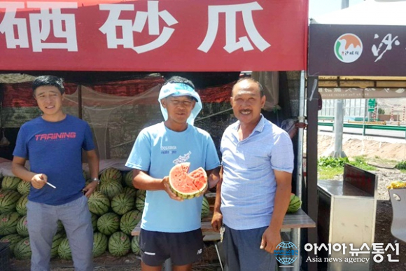 | 닝샤후이족자치구(寧夏回族自治區) 사파토우 언덕을 오르기 전에 수박 파는 행상과 함께.(사진=장용) |