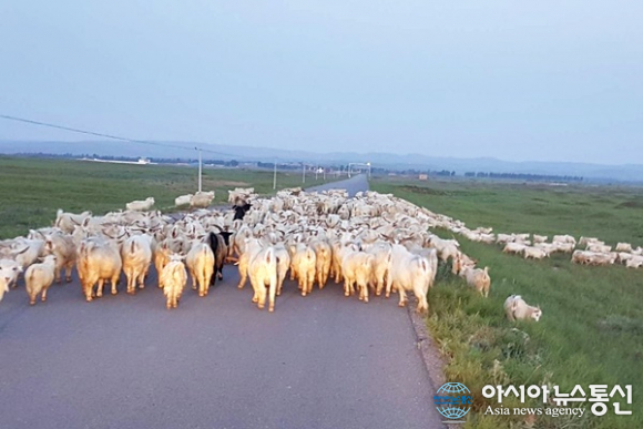 | 중국 산시성(陝西省) 딩벤현(定邊縣)으로 가는 길에 양떼가 길목을 가로막고 지나고 있다.(사진=장용) |