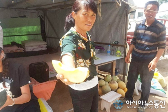 | 중국 산시성(陝西省) 딩티엔에서 안비안으로 가는 길에는 수박 행상이 내미는 하미과 조각.(사진=장용) |