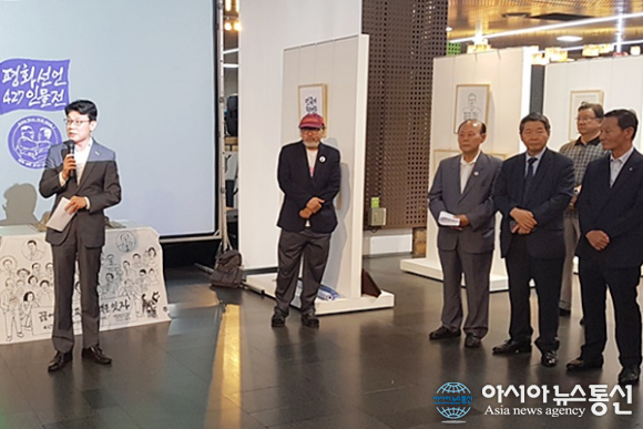 이날 개막식은 427남북평화선언을 기념하고, 평화통일을 기원하며 유라시아 대륙을 달리고 있는 강명구 마라토너를 후원하기 위해 지난달 국회 전시회와 지난 10~11일 성남 전시회에 이어 열게 됐다.