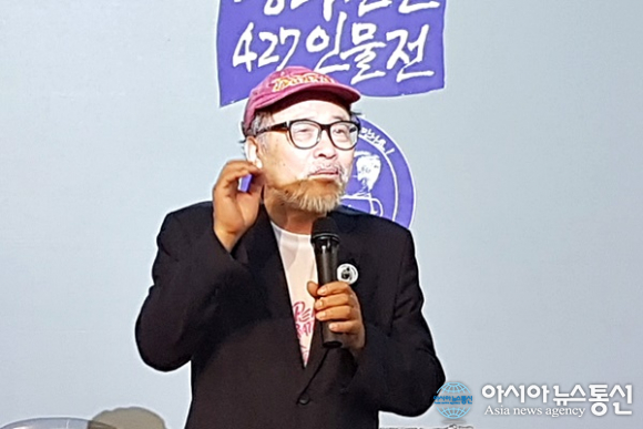 | 서울시청 평화인물전 개막식에서 김봉준 화백이 작품 설명을 하고 있다./아시아뉴스통신=홍근진 기자 |