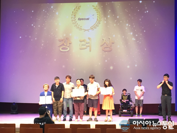 | 창원시 진해장애인복지관 소속 장애인 연극단 ‘햇빛촌’이 한국장애인문화예술단체총연합회가 주최하는 ‘제6회 대한민국장애인예술경연대회 스페셜K’에서 장려상을 수상하고 있다.(사진제공=진해장애인복지관) |