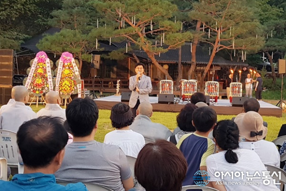 | 세종시 영평사가 18일 국운융창과 시의 발전을 위해 부정과 재앙을 소멸하는 낙화축제를 연 가운데 이춘희 시장이 한 여름 밤 전통 깊은 사찰에서 열린 행사를 축하하고 있다./아시아뉴스통신=홍근진 기자 |