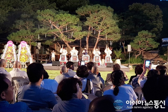 | 세종시 영평사가 18일 국운융창과 시의 발전을 위해 부정과 재앙을 소멸하는 낙화축제를 연 가운데 전통연희단 난장앤판이 신나게 흥을 돋구는 '모듬북' 공연을 하고 있다./아시아뉴스통신=홍근진 기자 |