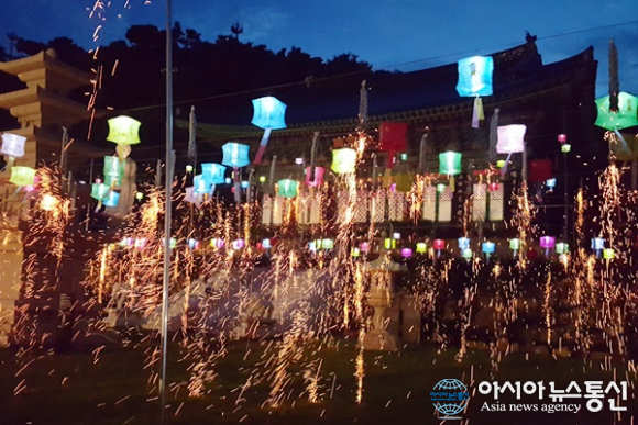 | 세종시 영평사가 18일 국운융창과 시의 발전을 위해 부정과 재앙을 소멸하는 낙화축제를 연 가운데 여름 밤 대웅전 앞에 걸어 놓은 연등과 떨어지는 낙화가 한 폭의 그림 같다./아시아뉴스통신=홍근진 기자 |