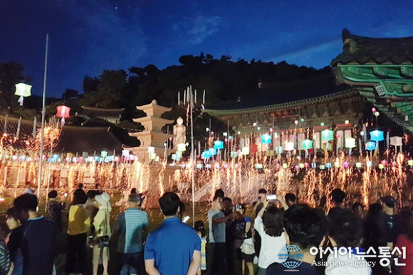 | 세종시 영평사가 18일 국운융창과 시의 발전을 위해 부정과 재앙을 소멸하는 낙화축제를 연 가운데 한 여름 밤 사찰에 모인 시민과 불자들이 떨어지는 낙화를 즐기고 있다./아시아뉴스통신=홍근진 기자 |