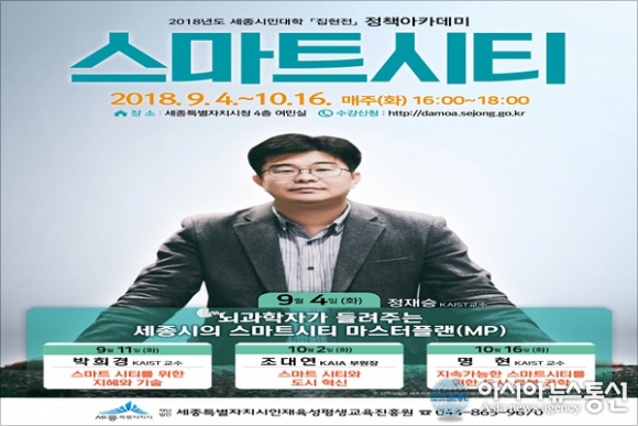 먼저 다음달 4일에는 국가시범도시 마스터플래너(MP)인 뇌과학자 정재승 KAIST 교수의 ‘뇌과학자가 들려주는 세종스마트시티의 마스터플랜’ 강의가 열릴 예정이다.