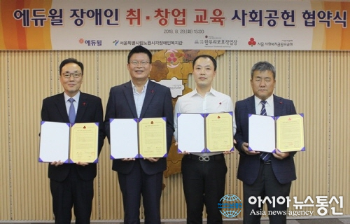 에듀윌 사회공헌위원회는 지난달 28일 서울 중구에 위치한 서울 사회복지공동모금회회관에서 서울 사회복지공동모금회, 노원시각장애인복지관, 한우리보호작업장과 ‘장애인 취업교육’ 협약식을 체결했다.