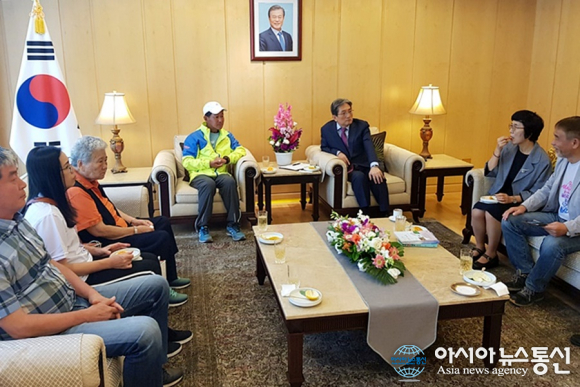 | 8일(현지시간) 중국 북경에서 노영민 주중대사를 만나고 있는 강명구 평화마라토너.(사진제공=평마사) |