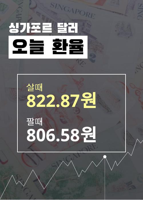 현재시각 기준 싱가폴달러화는 살때 기준 822.87원으로 전주 대비 0.24%증가했으며 팔때 기준 806.58원으로 0.25% 증가했다.