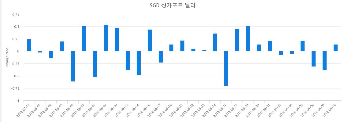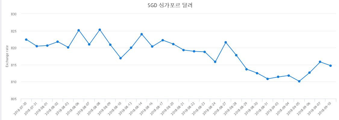 9월 10일 한국수출입은행이 매일 발표하는 환율통계에 따르면 10일의 싱가폴달러화 환율은 814.73원을 나타냈다. 이는 전날과 비교해 -0.13%한 가격이다.