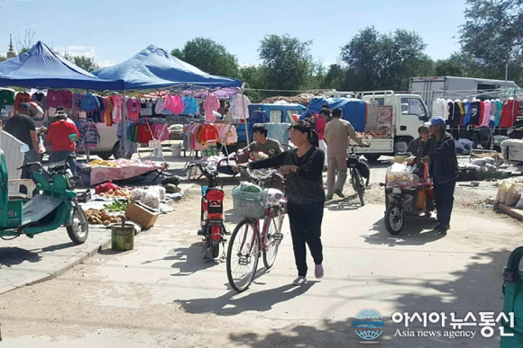 | 중국 허베이성(河北省) 시골 장터에 자전거와 오토바이를 타고와서 장을 보고 있는 사람들.(사진=장용) |