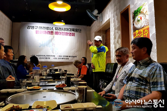 | 중국 북경 입성을 축하하기 위해 현지 교민들과 서울서 온 사람들이 만찬을 함께 하고 있다.(사진=장용) |