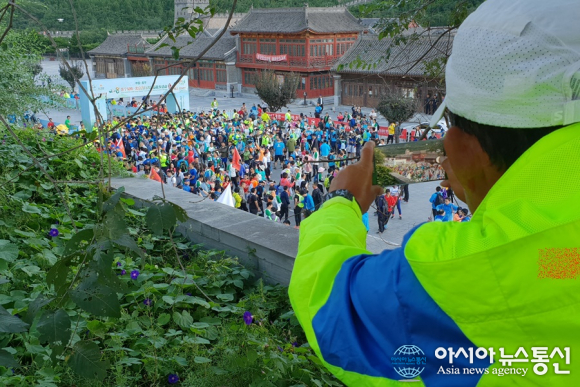 | 중국 허베이성(河北省) 창평(昌平)에서 자선 걷기대회가 열린 모습을 찍고 있는 강명구 선수.(사진=장용) |