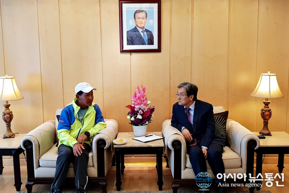 | 중국 북경 입성을 환영하기 위해 초청해 준 노영민 대사와 이야기를 나누고 있는 강명구씨.(사진=장용) |
