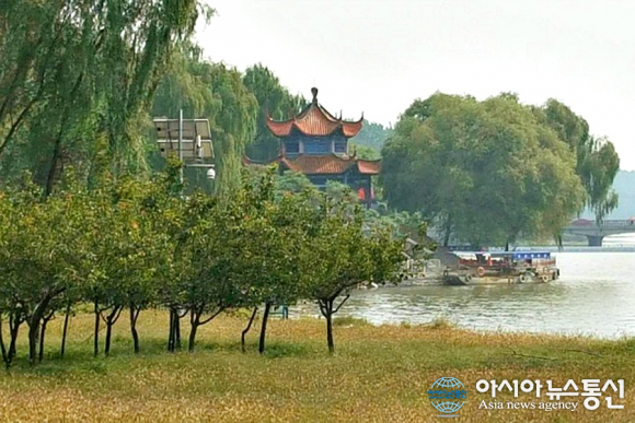 | 중국 북경 외곽 興林區에 있는 수상공원에 멋진 누각과 나무, 배와 다리가 그림같이 서있다.(사진=장용) |
